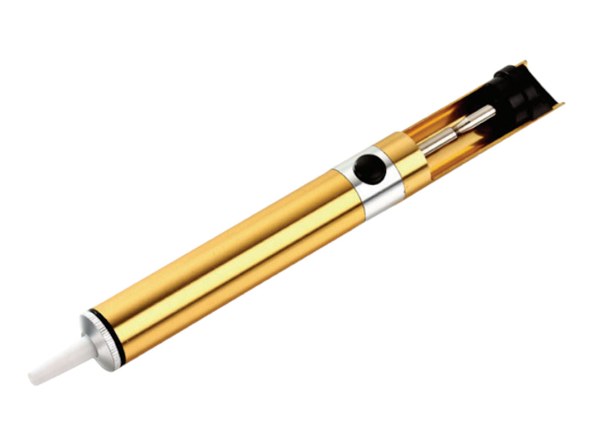 This all-metal housing desoldering pump operates via a spring-powered piston to suck the molten solder into the built-in reservoir.