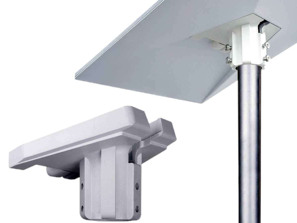 It clamps onto a round pole (typically 25–51mm / up to ~2" diameter) and provides a Starlink-compatible socket so you can click the dish into place, route the cable neatly down the pole, and keep your Starlink warranty intact because you’re not drilling into the dish itself.